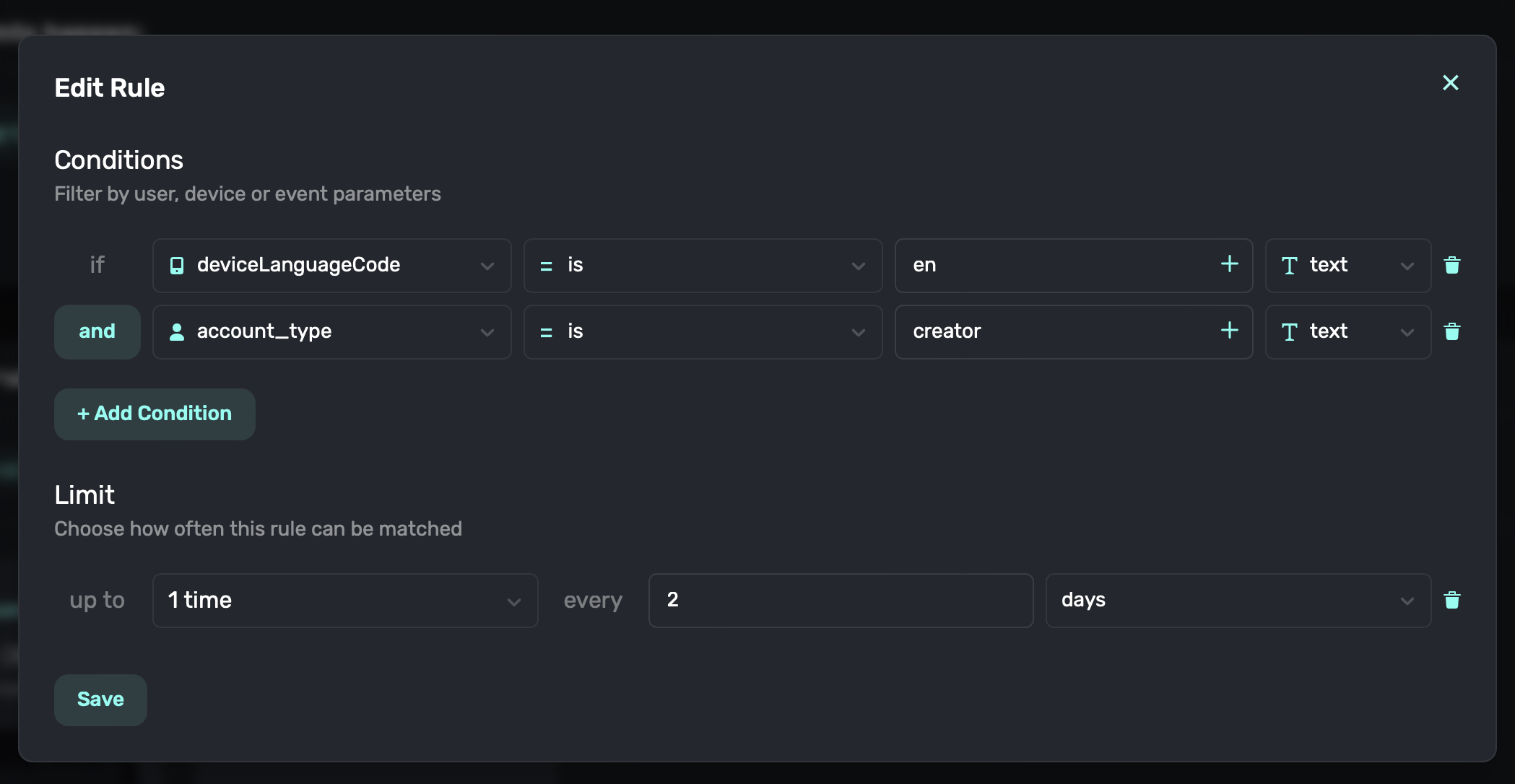 In this example, only users who have the en deviceLanguageCode and have a creator account_type will match this rule. They will only match this rule once every 2 days.